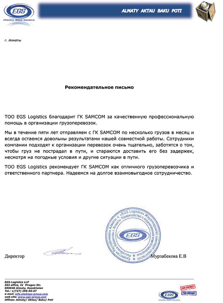 «Благодарит ГК SAMCOM за качественную профессиональную помощь в организации грузоперевозок. Мы в течении 5 лет отправляем с ГК SAMCOM по несколько грузов в месяц...»